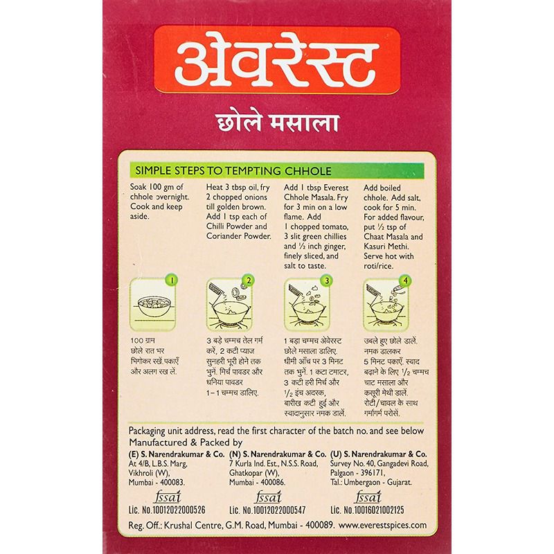 Everest Chhole Masala – An exquisite blend of 24 pure spices, this is perhaps the most elaborate blend in the Everest repertoire. This blend is evenly balanced for taste and flavour and imparts a rare character to chhole, made from chickpeas.