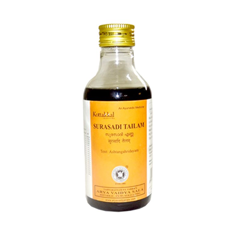 Surasadi tailam is used for the treatment of sinusitis, bronchial diseases, cough, chronic catarrh and chronic wounds. It is a proprietary Ayurvedic medicine, manufactured by Arya Vaidya Sala, Kottakkal.