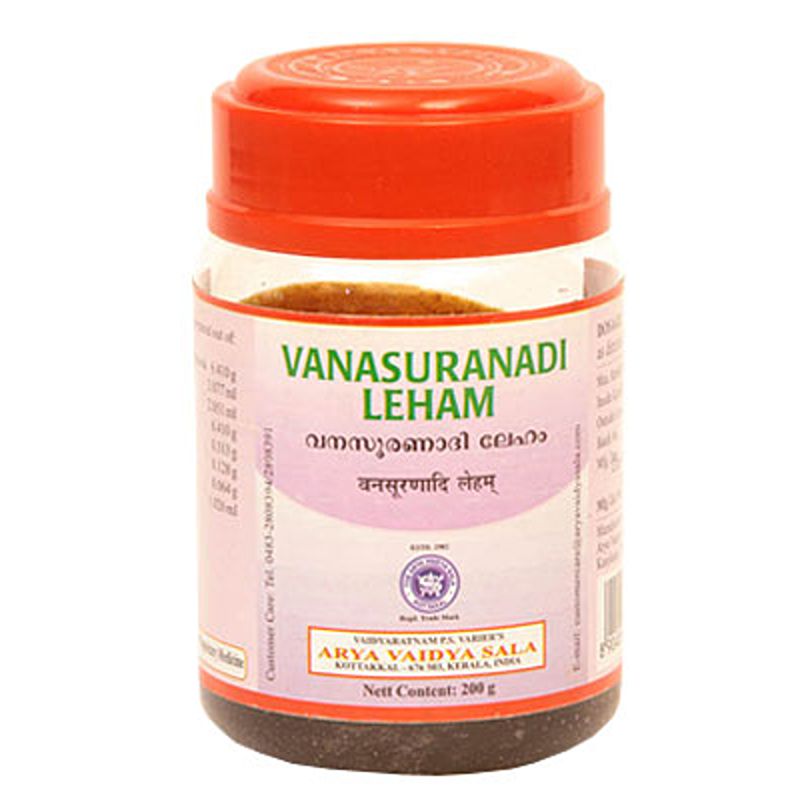 Vanasuranadi Leham is used for the treatment of Piles and Allied indigestion, Loss of appetite, Pallor and Indolence. It is a proprietary Ayurvedic medicine, manufactured by Arya Vaidya Sala, Kottakkal. Vanasuranadi Leham is a herbal jam/paste formulation.