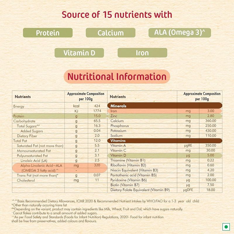 Nestle CERELAC Multigrain Dal Veg with No Refined Sugar is a complementary baby food for infants from 12 to 24 months. It is also a source of 15 important nutrients including vitamins and minerals. With Protein, Iron, Calcium, ALA (Omega 3) & Vitamin D. This baby food cereal is packed with the goodness of cereal, milk, Dal and vegetables. With 155 years of scientific expertise in infant nutrition, Nestle develops infant nutrition products backed by evolving science and research. Innovation has been at the heart of Nestle since its beginning. Contains No Refined Sugar.