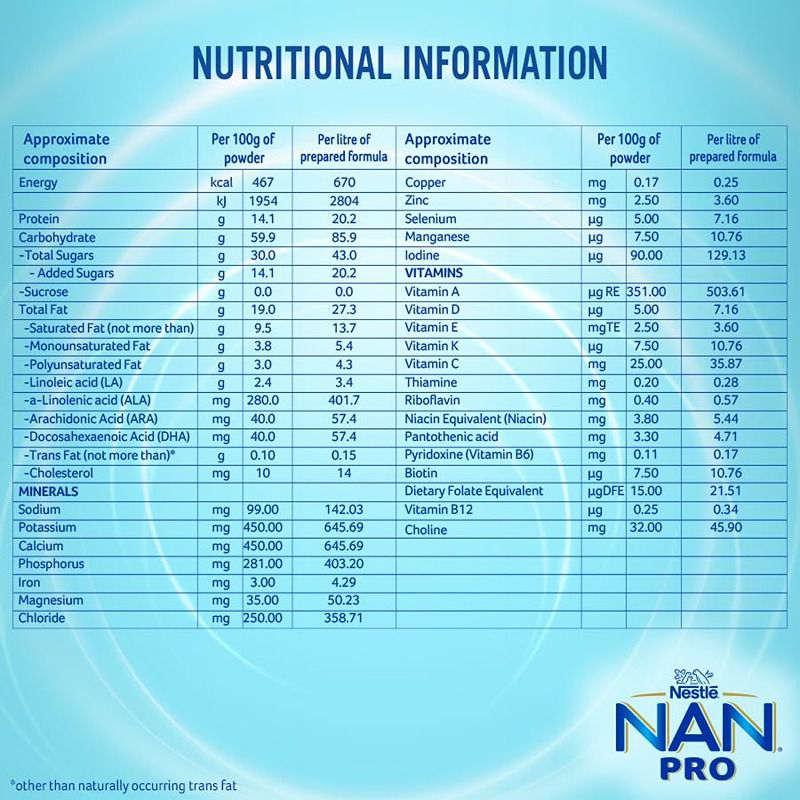 Nestle NAN PRO 3 is a spray dried follow-up formula with DHA, ARA, Vitamins and Minerals for babies after 12 months when they are not breastfed. NAN PRO 3 contains DHA, which helps support normal brain development. It contains Iron, which helps support normal cognitive development and also maintain normal immune system function. This follow-up formula also contains Vitamin A, C, & Zinc, which contribute to normal immune system function; and Calcium & Vitamin D to support bone growth and development