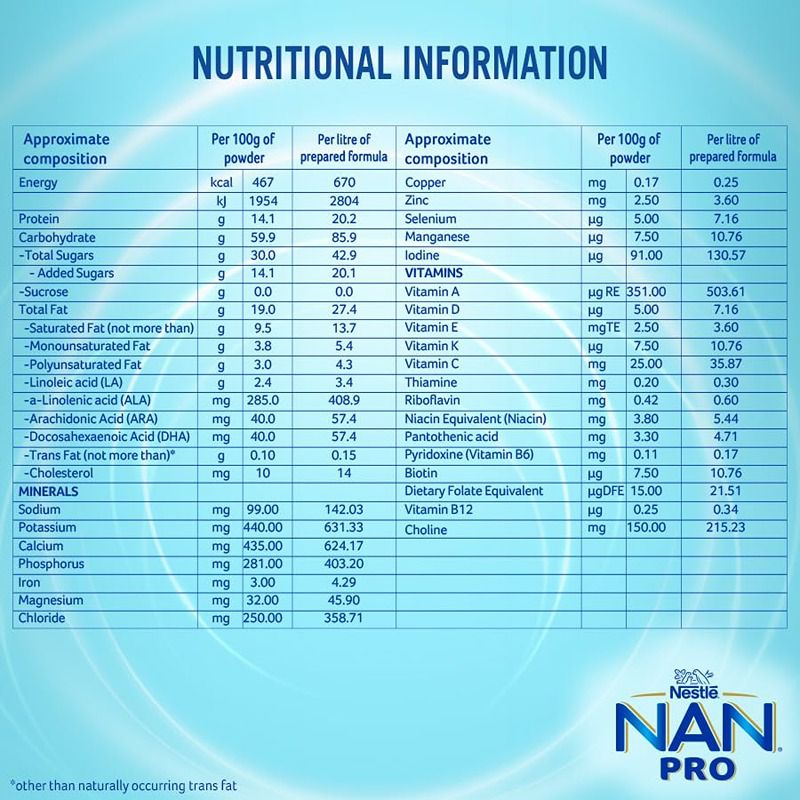 Nestle NAN PRO 4 is a spray dried follow-up formula with DHA, ARA, Vitamins and Minerals for babies after 18 months when they are not breastfed. NAN PRO 4 contains DHA, which helps support normal brain development. It contains Iron, which helps support normal cognitive development and also maintain normal immune system function. This follow-up formula also contains Vitamin A, C, & Zinc, which contribute to normal immune system function; and Calcium & Vitamin D to support bone growth and development.