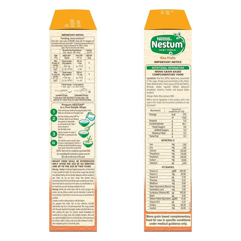 Nestle NESTUM Baby Cereal (Rice Fruits) is a processed mono grain based complimentary food for babies from 10 months up to 24. . This baby growth food is a source of 14 nutrients including vitamins and minerals and contains Vitamin A, Zinc, Iron, Selenium and Vitamin C. Nestle NESTUM is free from preservatives, added colours, and flavours.
