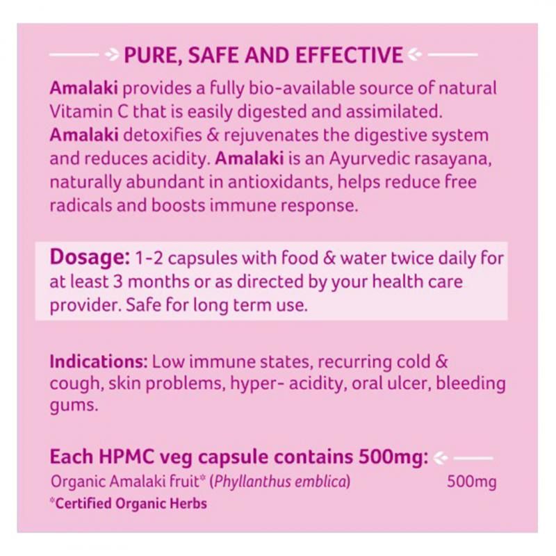 Amalaki provides a fully bio-available source of natural Vitamin C that is easily digested and assimilated. Amalaki detoxifies and rejuvenates the digestive system and reduces acidity. Amalaki is an Ayurvedic Rasayana, naturally abundant in antioxidants, helps reduce free radicals and boosts immune response.